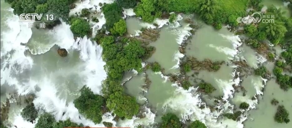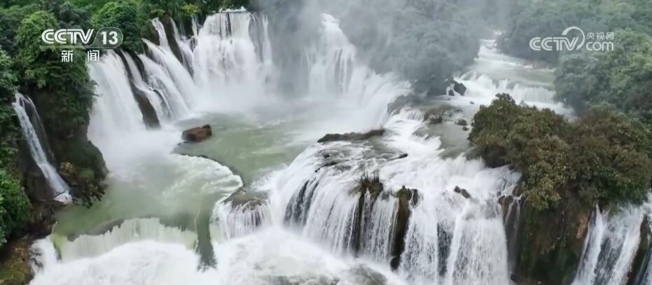 跟隨鏡頭,現(xiàn)在我們來(lái)到廣西崇左的德天跨國(guó)瀑布。它發(fā)源于廣西的歸春河,流向越南,又繞回廣西,最終在德天村遇斷崖形成瀑布。眼下,正值豐水期,德天跨國(guó)瀑布迎來(lái)最佳觀賞季。浩浩蕩蕩的河水從斷崖層層跌落,發(fā)出震撼的轟鳴聲,激起的水花騰空而上,讓人不禁感嘆大自然的神奇與美妙。