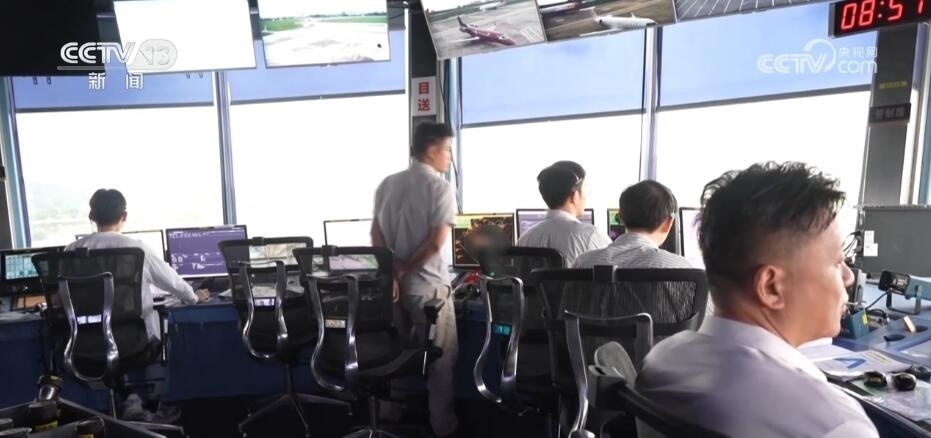 這里就是控制整個機場航班的“中樞”所在——空管塔臺,伴隨著一句句簡短的指令發(fā)出,一架架滿載著旅客的客機有序起降。管制員們一邊緊盯電腦雷達顯示器,一邊查看機場跑道情況,指揮調控飛機的飛行線路和高度。