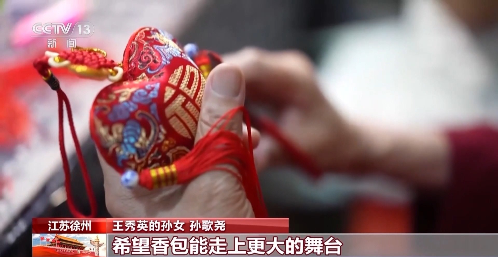 王秀英的孫女 孫歌堯:我奶奶是第三代傳承人,她已經(jīng)做了70多年了,到我這里是第五代,我覺得我也是有必要把它傳承下去。希望香包能走上更大的舞臺,能走出徐州,走向世界。