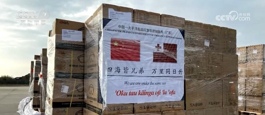 空軍航空兵某團 楊樹帥:當(dāng)時我們集裝的貨物上都印有一面中國國旗和(一面)湯加國旗,并印了一句中國古詩“四海皆兄弟,萬里同日升”。