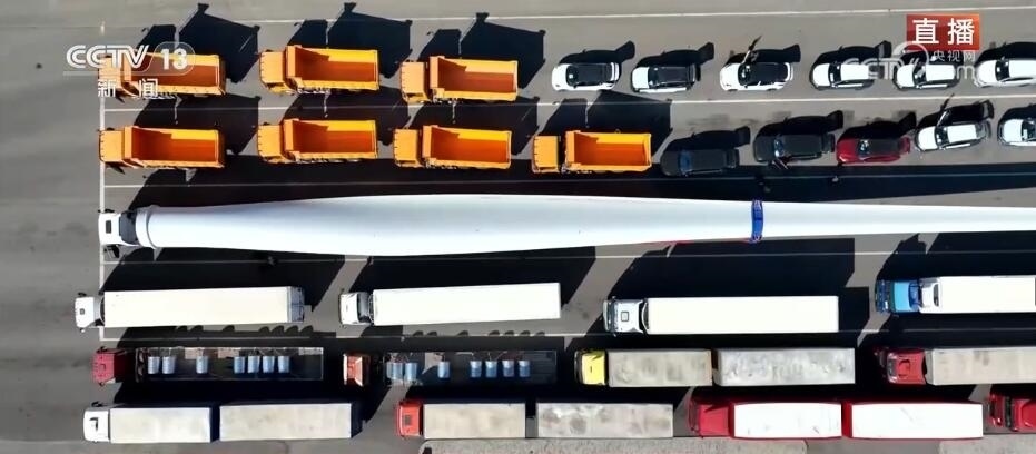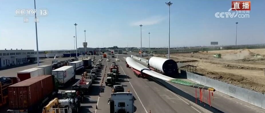 看這邊。大家知道這個(gè)龐大的家伙是什么嗎?它是風(fēng)力發(fā)電機(jī)上的一個(gè)扇葉。根據(jù)不同型號(hào),短的扇葉有三四十米,長的有七八十米,龐大的塊頭也讓它在出口貨物中格外亮眼。它的這種“出”,出的不僅僅是設(shè)備,還有帶著“中國技術(shù)”的風(fēng)電項(xiàng)目。中亞地區(qū)有非常豐富的風(fēng)力資源,來自中國的風(fēng)電項(xiàng)目、風(fēng)電技術(shù)正全面助力共建“一帶一路”國家的綠色能源發(fā)展。當(dāng)?shù)卣秃jP(guān)還專門將出境通道拓寬了半米,讓這種超寬、超長的大型設(shè)備能夠順利出境。