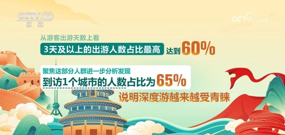中國(guó)移動(dòng)梧桐大數(shù)據(jù)借助通信服務(wù)、算力網(wǎng)絡(luò),對(duì)全國(guó)用戶(hù)漫游、通信等數(shù)據(jù)進(jìn)行統(tǒng)計(jì)分析后發(fā)現(xiàn),從9月29日至10月6日,各地旅游人數(shù)和相關(guān)消費(fèi)均大幅上漲。其中,短途游熱度不減,中長(zhǎng)途游持續(xù)升溫。200公里以?xún)?nèi)的短途游占比達(dá)到38%;200—500公里的中等距離出游占比32%;500公里以上長(zhǎng)途游占比為30%。從游客出游天數(shù)上看,3天及以上的出游人數(shù)占比最高,達(dá)到60%。聚焦這部分人群進(jìn)一步分析發(fā)現(xiàn),到訪1個(gè)城市的人數(shù)占比為65%,說(shuō)明深度游越來(lái)越受青睞。