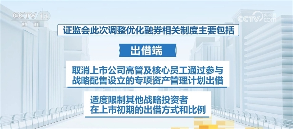 證監(jiān)會(huì)此次調(diào)整優(yōu)化融券相關(guān)制度主要包括:融券端,將融券保證金比例由不得低于50%上調(diào)至80%,對(duì)私募證券投資基金參與融券的保證金比例上調(diào)至100%;出借端,取消上市公司高管及核心員工通過(guò)參與戰(zhàn)略配售設(shè)立的專(zhuān)項(xiàng)資產(chǎn)管理計(jì)劃出借,適度限制其他戰(zhàn)略投資者在上市初期的出借方式和比例。