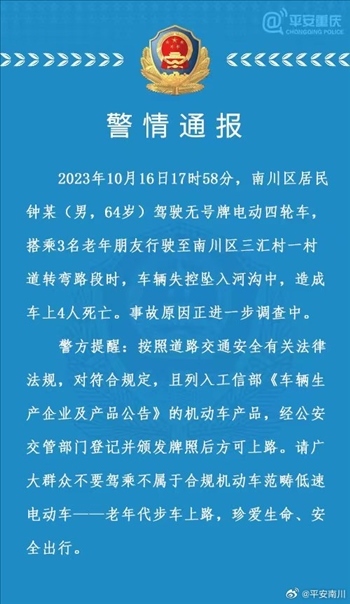 ·重慶警方通報(bào):老人駕駛無牌電動四輪車搭載3名老年朋友失控墜河,4人死亡。