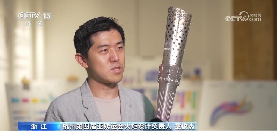 杭州第四屆亞殘運(yùn)會(huì)火炬設(shè)計(jì)負(fù)責(zé)人 章俊杰:玉琮是實(shí)證中華五千年(文明史)的良渚(遺址)文明當(dāng)中的一個(gè)重要禮器,我們把玉琮作為核心意象,外方內(nèi)圓,我們?cè)谂e起火炬的時(shí)候,所有人的視覺焦點(diǎn)玉琮它承上啟下,分別代表了不同的寓意。承上,我們用點(diǎn)點(diǎn)的星光匯聚成桂花桂冠,可以看到星光越來越稠密,這是我們希望體現(xiàn)整個(gè)火炬設(shè)計(jì)的積極向上的那種力量感;玉琮往下,在這個(gè)地方設(shè)計(jì)有幾十條的科技線,它就好像是綿延著人類的歷史和城市科技的脈絡(luò)。