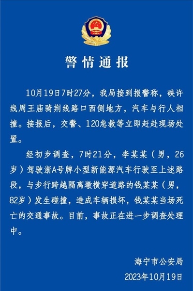 ·浙江海寧82歲老人橫穿馬路被撞身亡,警方通報:事故正在進一步調查處理。