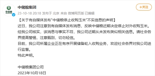 ·中儲糧集團辟謠停止收購玉米:近期從未發(fā)布類似相關信息。