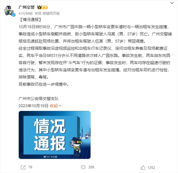 ·廣州交警通報寶馬車與出租車發(fā)生碰撞后撞上橋墩起火、駕駛人死亡事件:兩車均超速、未發(fā)現(xiàn)開“斗氣車”。出租車所屬公司發(fā)聲:司機已盡力剎車,但確實存在超速。