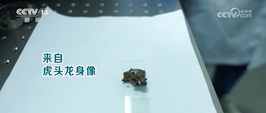 四川省文物考古研究院館員 肖慶:這件樣品是從8號(hào)坑的虎頭龍身像上取下來(lái)的樣品。這件器物的特別之處就是在它的底座上,有很多紅顏色類(lèi)似顏料樣的東西。現(xiàn)在要做的就是來(lái)確定這個(gè)紅色的顏料到底是什么物質(zhì)。