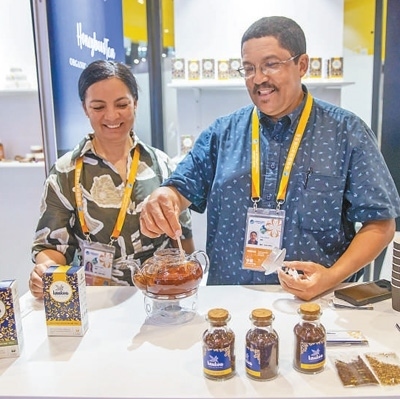 在食品及農(nóng)產(chǎn)品展區(qū),南非參展商展示當(dāng)?shù)靥禺a(chǎn)蜜樹(shù)茶。本報(bào)記者 張武軍攝