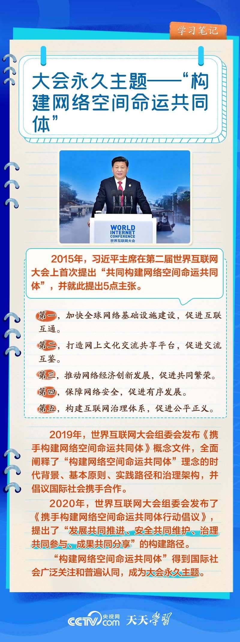 前九屆世界互聯(lián)網(wǎng)大會,習近平主席或親臨現(xiàn)場發(fā)表主旨演講,或視頻致辭,或向大會發(fā)來賀信,以不同形式關心大會舉辦。央視網(wǎng)《天天學習》欄目推出學習筆記,與您一起了解世界互聯(lián)網(wǎng)大會的十年“網(wǎng)”事。