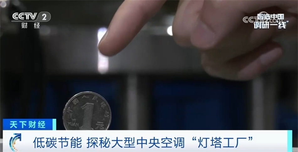 我現(xiàn)在走進(jìn)的這個(gè)區(qū)域是空調(diào)產(chǎn)線的末端——檢測(cè)平臺(tái)。每一臺(tái)空調(diào)出廠前都要在這里經(jīng)過全方位的檢測(cè)。眼前這就是一臺(tái)正在運(yùn)轉(zhuǎn)的氣懸浮中央空調(diào),我們?cè)诳照{(diào)上立了一枚硬幣,可以看到是紋絲不動(dòng)的,這也是氣懸浮的特點(diǎn)之一——運(yùn)行比較平穩(wěn)。在這塊屏幕上顯示著空調(diào)的出水溫度7℃,恒定的出水溫度讓這臺(tái)空調(diào)產(chǎn)生的冷風(fēng)非常柔和。目前,這座工廠全流程的自動(dòng)化生產(chǎn)能夠滿足從小型商用空調(diào)生產(chǎn)到用戶需求的大規(guī)模定制。目前低能耗、智能化產(chǎn)品已應(yīng)用在商業(yè)地產(chǎn)、酒店、軌道交通等各種場(chǎng)景,極大程度助力著國(guó)家“雙碳”政策以及各大行業(yè)的低碳轉(zhuǎn)型。