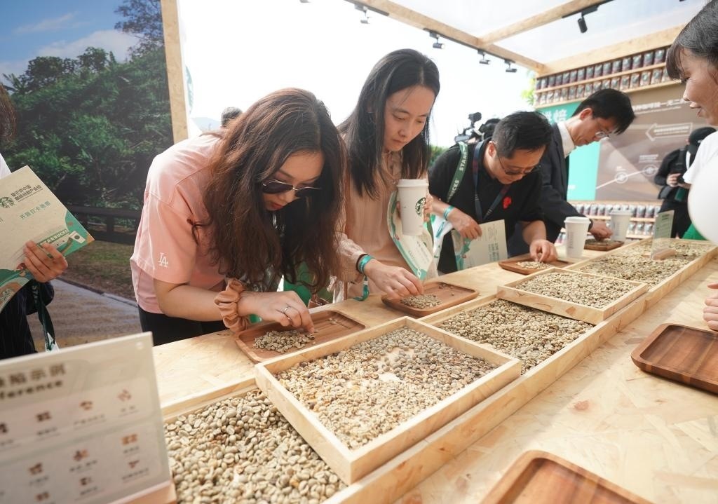 9月19日,在星巴克中國咖啡創(chuàng)新產(chǎn)業(yè)園開園儀式現(xiàn)場(chǎng),來賓在體驗(yàn)挑揀咖啡生豆。當(dāng)日,星巴克中國咖啡創(chuàng)新產(chǎn)業(yè)園在江蘇昆山落成投產(chǎn)。