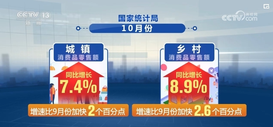 國家統(tǒng)計(jì)局最新數(shù)據(jù)顯示,在縣鄉(xiāng)消費(fèi)市場(chǎng)基礎(chǔ)設(shè)施不斷完善、有效供給持續(xù)擴(kuò)大等有利條件帶動(dòng)下,鄉(xiāng)村市場(chǎng)銷售增速快于城鎮(zhèn)。10月份,城鎮(zhèn)、鄉(xiāng)村消費(fèi)品零售額同比分別增長(zhǎng)7.4%和8.9%,增速比9月份分別加快2和2.6個(gè)百分點(diǎn)。