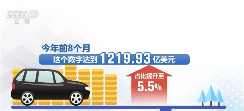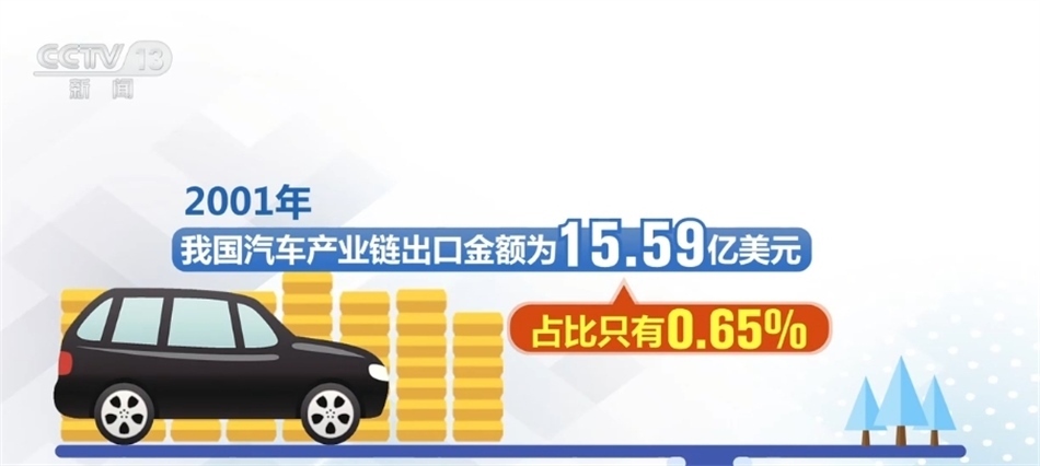 中國貿(mào)促會汽車分會負責(zé)人表示,2001年,我國汽車產(chǎn)業(yè)鏈出口金額為15.59億美元,占比只有0.65%。今年前8個月,這個數(shù)字達到1219.93億美元,占比提升至5.5%。