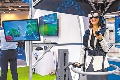 第二十一屆中國(蘇州)電子信息博覽會日前在蘇州工業(yè)園區(qū)舉辦。圖為觀眾在博覽會上體驗(yàn)5G+元宇宙游戲。張 鋒攝(人民視覺)