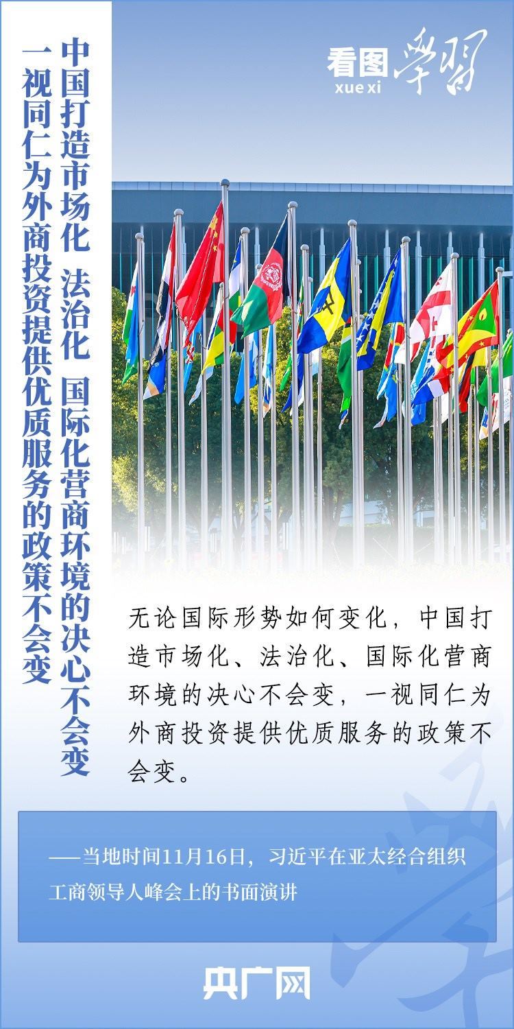 當(dāng)?shù)貢r間11月16日,國家主席習(xí)近平應(yīng)邀出席亞太經(jīng)合組織工商領(lǐng)導(dǎo)人峰會并發(fā)表書面演講。習(xí)主席深刻總結(jié)了亞太經(jīng)濟(jì)合作30年來非凡成就和啟示,對亞太合作下一個30年將走向何方這一新的時代之問提出中國答案,重申“中國打造市場化、法治化、國際化營商環(huán)境的決心不會變,一視同仁為外商投資提供優(yōu)質(zhì)服務(wù)的政策不會變”,向全球工商界發(fā)出邀請,歡迎“積極參與中國式現(xiàn)代化進(jìn)程,共享中國高質(zhì)量發(fā)展帶來的巨大機(jī)遇!”一起來學(xué)習(xí)。