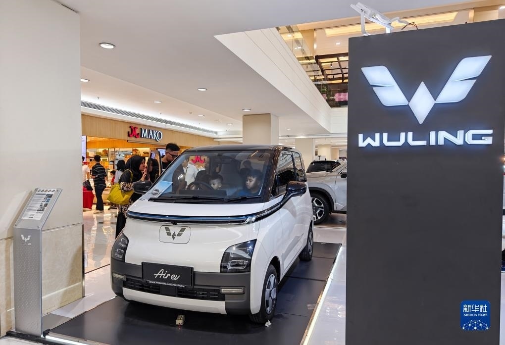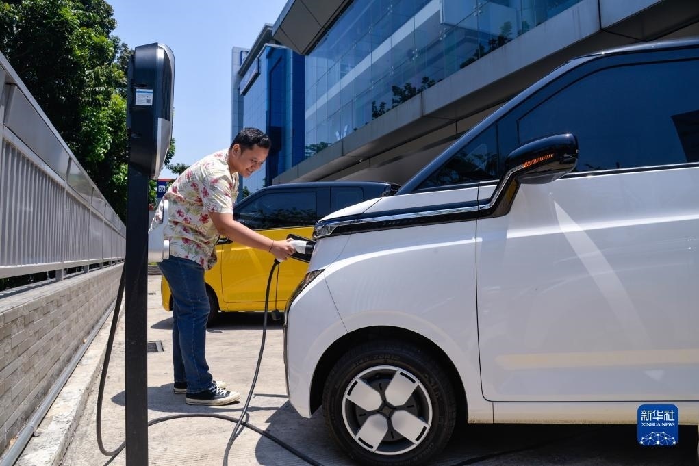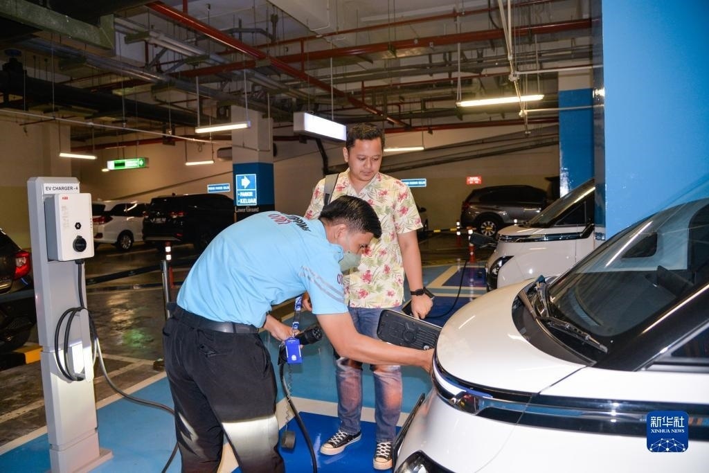 9月29日,在印度尼西亞雅加達(dá)一家商場的地下停車場,工作人員為一位五菱新能源車Air ev車主結(jié)束充電。新華社記者 徐欽 攝