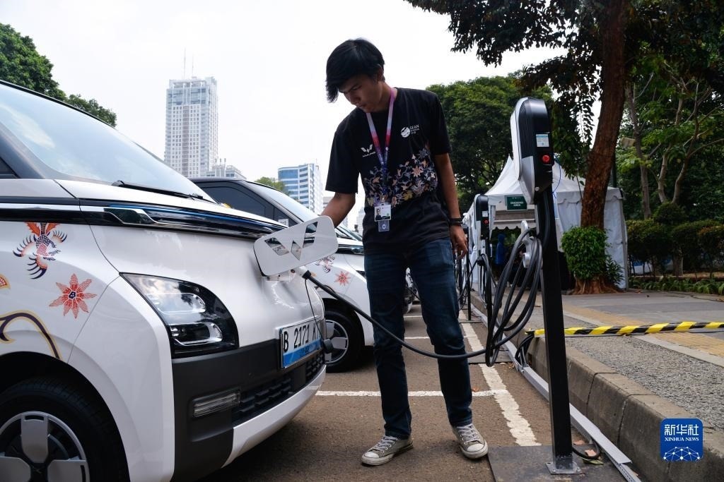 9月6日,在印度尼西亞雅加達(dá)第43屆東盟峰會五菱汽車服務(wù)站,工作人員為一輛五菱新能源車Air ev充電。新華社記者 徐欽 攝