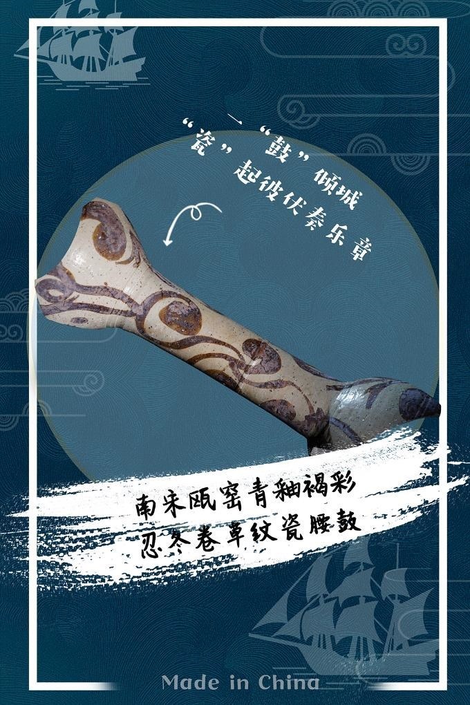 南宋甌窯青釉褐彩忍冬卷草紋瓷腰鼓