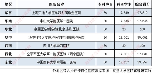 分地區(qū)看,中國(guó)醫(yī)學(xué)科學(xué)院北京協(xié)和醫(yī)院和四川大學(xué)華西醫(yī)院分別以專科聲譽(yù)(80)、科研學(xué)術(shù)(20)雙滿分的成績(jī)領(lǐng)跑華北地區(qū)、西南地區(qū)的綜合排行榜,中國(guó)醫(yī)科大學(xué)附屬第一醫(yī)院和華中科技大學(xué)同濟(jì)醫(yī)學(xué)院附屬同濟(jì)醫(yī)院則分別以99.257和99.061的成績(jī)領(lǐng)跑東北地區(qū)和華中地區(qū)。此外,上海交通大學(xué)醫(yī)學(xué)院附屬瑞金醫(yī)院、中山大學(xué)附屬第一醫(yī)院、空軍軍醫(yī)大學(xué)第一附屬醫(yī)院(西京醫(yī)院)也分別在各地區(qū)的綜合排行榜中位列首位。