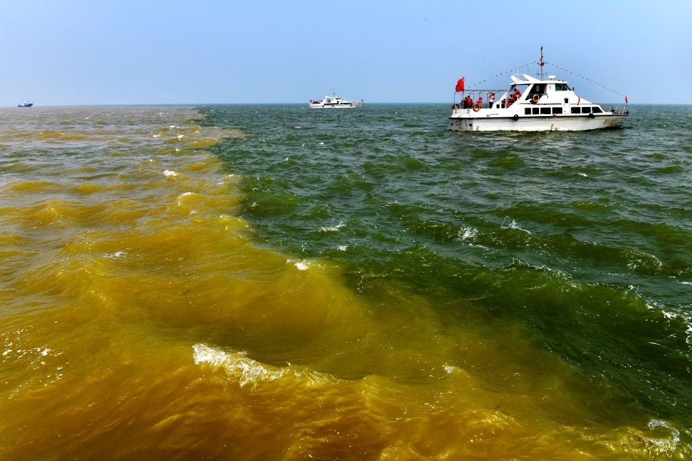 在山東省東營市黃河入海口,黃河匯入渤海,形成獨(dú)特景觀(2021年5月13日攝)。