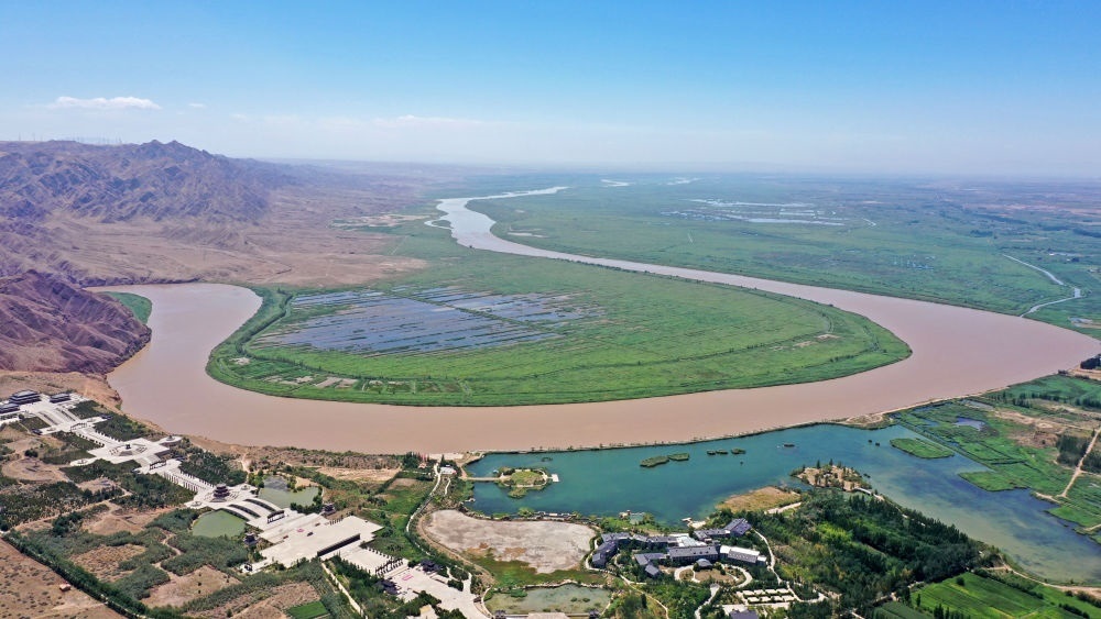 位于寧夏青銅峽市的黃河大拐彎景觀(2021年8月5日攝)。