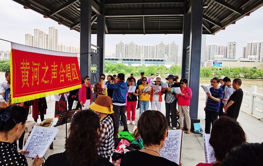 在蘭州市城關(guān)區(qū)黃河治理蘭鐵泵站項(xiàng)目點(diǎn),黃河之聲合唱團(tuán)開展合唱活動(dòng)(2020年6月15日攝)。