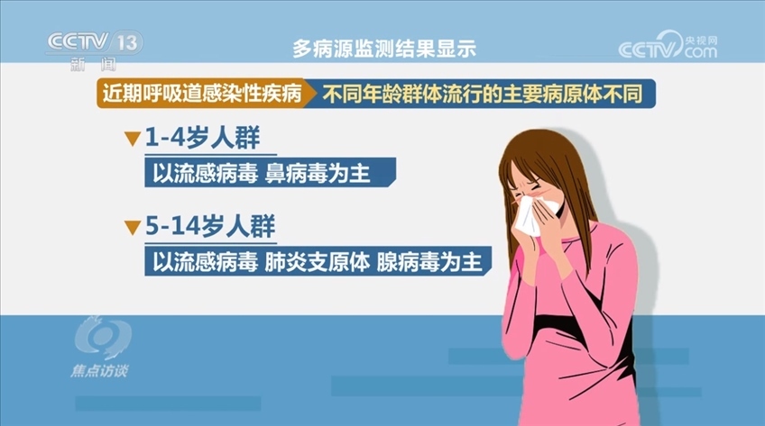 多病源監(jiān)測結果顯示,近期呼吸道感染性疾病不同年齡群體流行的主要病原體不同。1—4歲人群以流感病毒、鼻病毒為主,5—14歲人群以流感病毒、肺炎支原體、腺病毒為主,15—59歲人群以流感病毒、鼻病毒、新冠病毒為主,60歲及以上人群以流感病毒、人偏肺病毒和普通冠狀病毒為主。