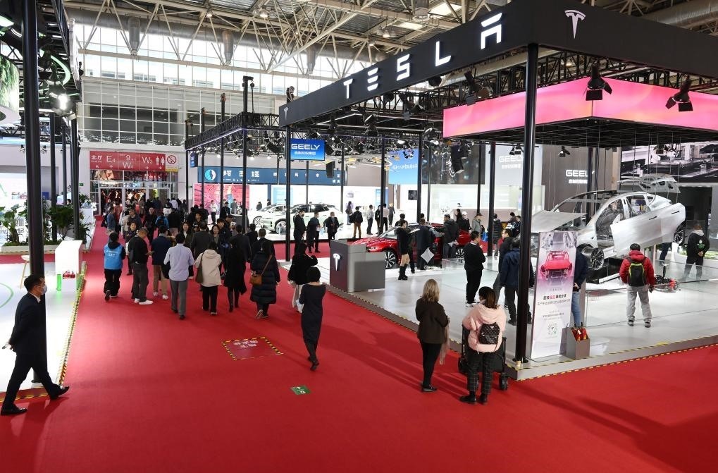 11月30日在鏈博會智能汽車鏈展區(qū)拍攝的特斯拉展位。新華社記者 任超 攝