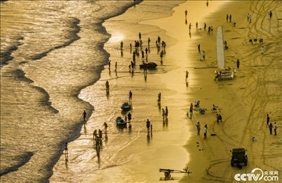 2023年12月3日,海南陵水,游客清水灣沙灘上戲水踏浪。