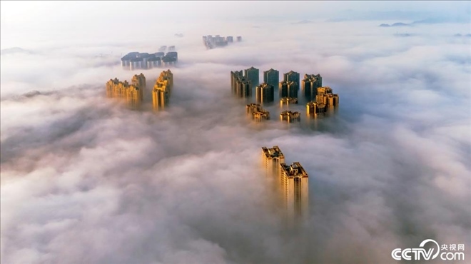 2023年12月4日,四川資陽安岳縣城區(qū)云霧繚繞,高樓云霧中若隱若現(xiàn)。
