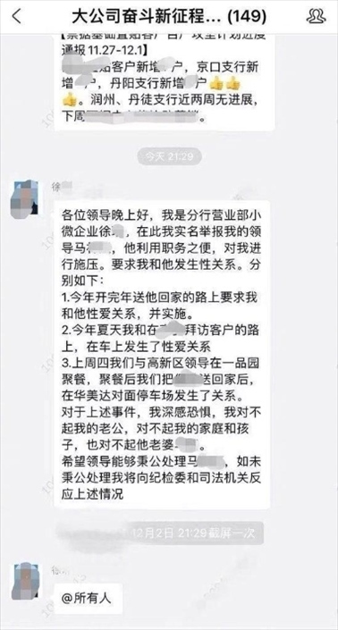·江蘇銀行鎮(zhèn)江分行回應(yīng)女員工舉報被領(lǐng)導(dǎo)施壓發(fā)生性關(guān)系:已免去馬某團(tuán)隊經(jīng)理職務(wù)。