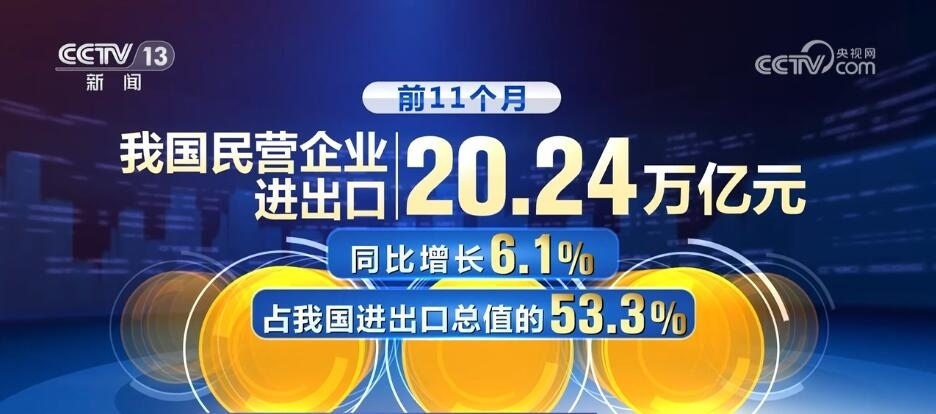前11個(gè)月,我國民營企業(yè)進(jìn)出口20.24萬億元,同比增長6.1%,占我國進(jìn)出口總值的53.3%,提升3.1個(gè)百分點(diǎn)。同期,上海、江蘇、浙江、安徽等長三角區(qū)域合計(jì)進(jìn)出口13.87萬億元,同比增長0.6%,其中出口同比增長1%,拉動(dòng)同期我國出口增長0.4個(gè)百分點(diǎn),強(qiáng)勁活躍的增長極功能不斷鞏固提升。???????