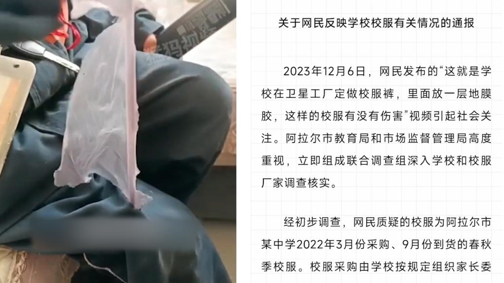 ·新疆阿拉爾官方通報校服褲夾層扯出疑似塑料膜:系脫落的校褲內(nèi)部復膜,已送檢。