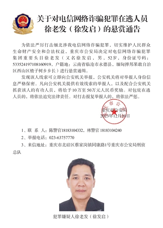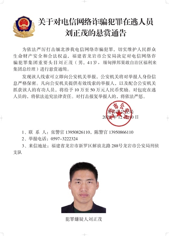 為依法嚴(yán)厲打擊緬北涉我電信網(wǎng)絡(luò)詐騙犯罪,切實(shí)維護(hù)人民群眾生命財(cái)產(chǎn)安全和合法權(quán)益,遼寧省大連市公安局決定對白所成、白應(yīng)蒼(又名李云晨)、白應(yīng)蘭(又名李夢娜)進(jìn)行公開懸賞通緝;福建省泉州市公安局決定對魏懷仁、魏榕(又名陳榕)、魏青松(又名楊松)進(jìn)行公開懸賞通緝;福建省龍巖市公安局決定對劉正祥、劉積光(又名李華光)、劉正茂進(jìn)行公開懸賞通緝;重慶市公安局決定對徐老發(fā)(又名徐發(fā)啟)進(jìn)行公開懸賞通緝。