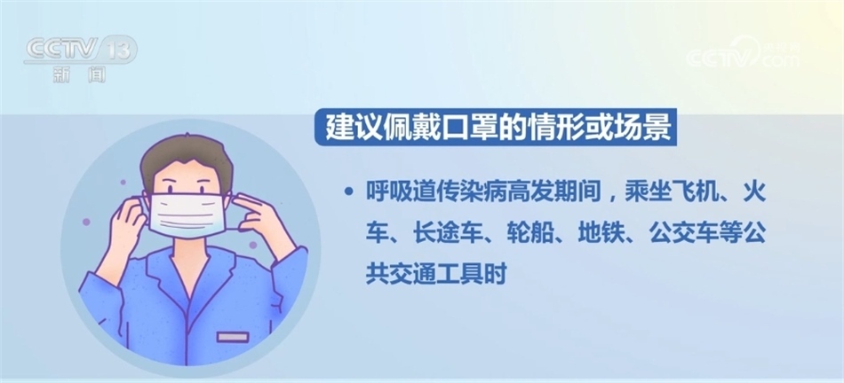 建議佩戴口罩的情形或場(chǎng)景包括:呼吸道傳染病高發(fā)期間,乘坐飛機(jī)、火車、長途車、輪船、地鐵、公交車等公共交通工具時(shí)。呼吸道傳染病高發(fā)期間,進(jìn)入超市、影劇院、客運(yùn)場(chǎng)站、廂式電梯等環(huán)境密閉、人員密集場(chǎng)所時(shí)。呼吸道傳染病高發(fā)期間,老年人、慢性基礎(chǔ)疾病患者、孕婦等前往室內(nèi)公共場(chǎng)所時(shí)。與出現(xiàn)呼吸道傳染病癥狀者共同學(xué)習(xí)、生活或工作期間。