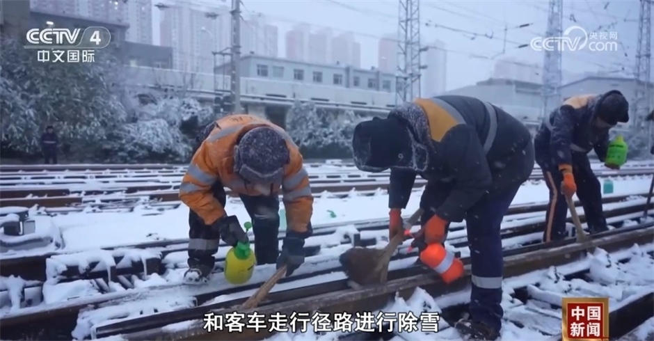 國鐵濟南局濟南工務(wù)段濟南線路車間工長 張鑫:著重對道岔的轉(zhuǎn)折部位和客車走行徑路進行除雪,清掃積雪后立即噴灑防凍液,確保道岔正常運轉(zhuǎn)不結(jié)冰。