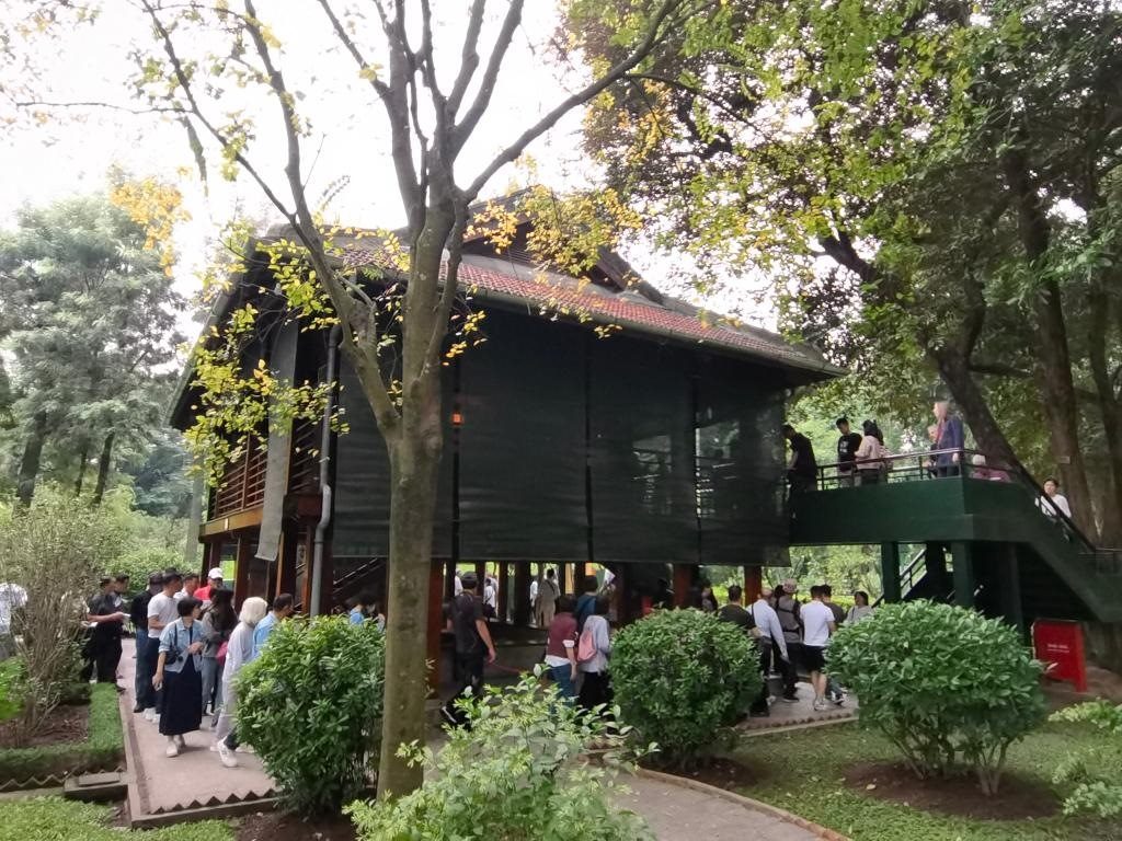 在河內(nèi)地標(biāo)巴亭廣場一側(cè),坐落著胡志明陵和胡志明故居。記者抵達(dá)廣場時(shí),守衛(wèi)胡志明陵的儀仗兵正在舉行換崗儀式,眾多民眾和游客高舉相機(jī)或手機(jī),記錄下這莊嚴(yán)肅穆的一刻。胡志明陵北側(cè)的胡志明故居內(nèi),各國游客排起長隊(duì),在他曾長期居住和工作的高腳屋下駐足留影。