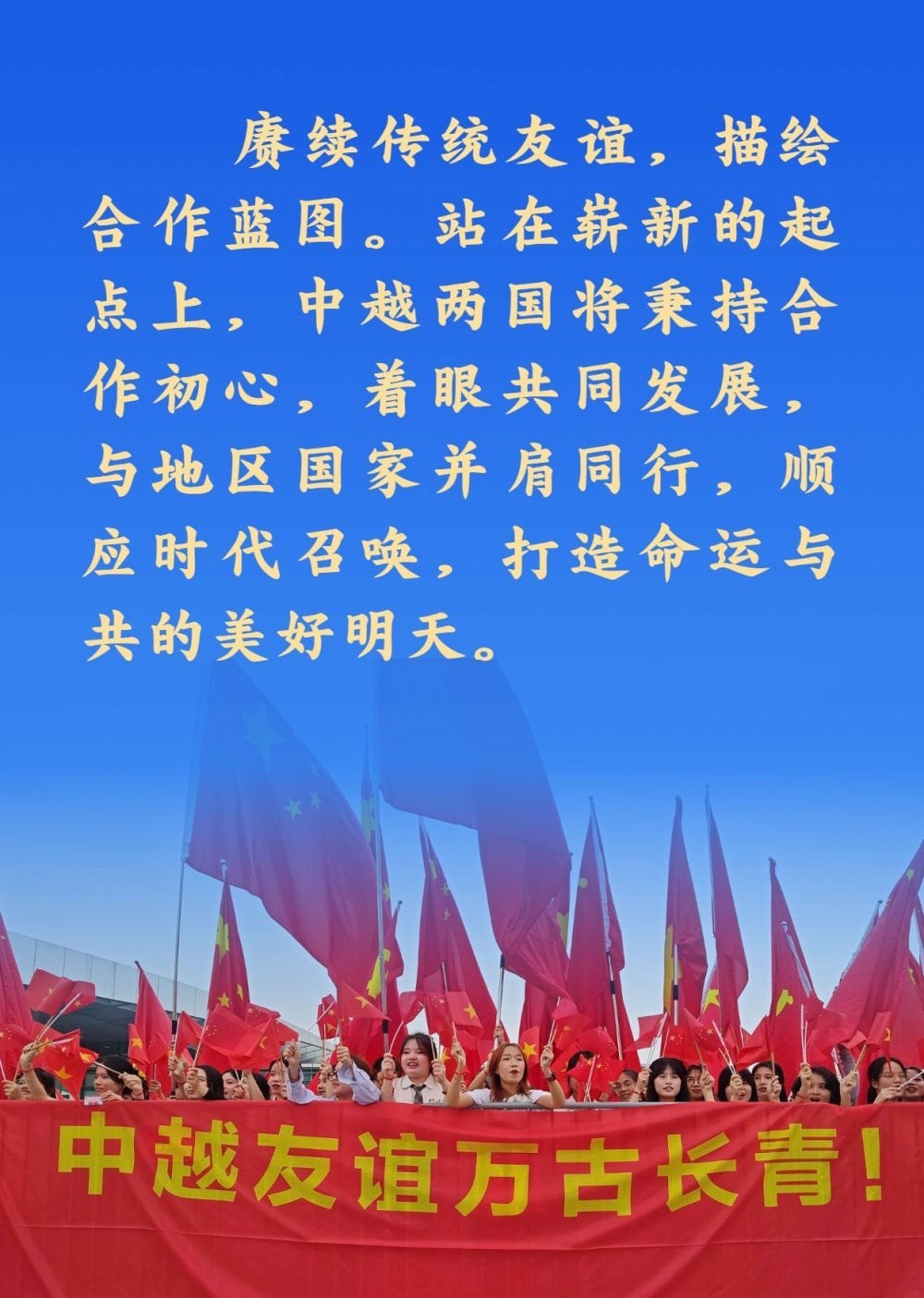 兩位總書記都認為,中越作為友好近鄰,理想相同,理念相通。作為好鄰居、好伙伴、好兄弟、好同志,中越構(gòu)建具有戰(zhàn)略意義的命運共同體具有天時、地利、人和的獨特優(yōu)勢。雙方應(yīng)該繼承老一輩領(lǐng)導(dǎo)人締結(jié)的傳統(tǒng)友誼,共同努力構(gòu)建命運共同體,走好各自的現(xiàn)代化道路,實現(xiàn)互利共贏、美美與共,造福兩國人民,也為地區(qū)和平與繁榮作出積極貢獻。
