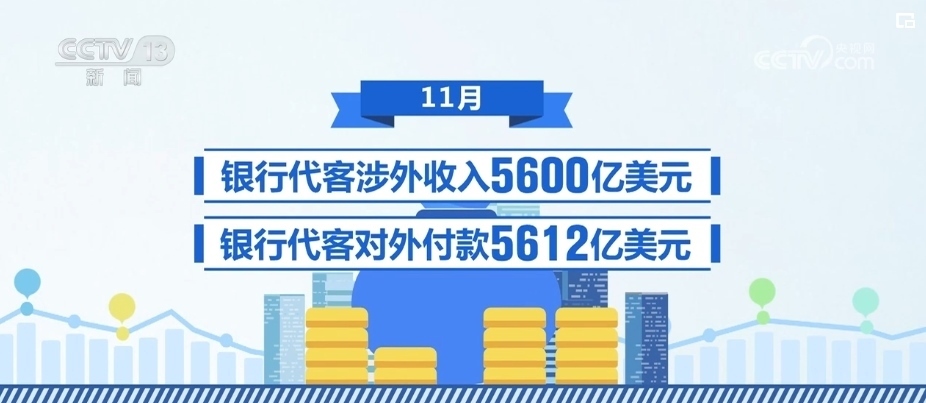11月,銀行代客涉外收入5600億美元,對(duì)外付款5612億美元。1—11月,銀行代客累計(jì)涉外收入56233億美元,累計(jì)對(duì)外付款57060億美元。