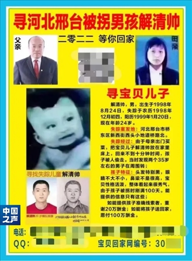 1999年1月20日,大寒,河北邢臺,剛滿百天的男嬰解清帥被人販子偷走。9000多個日夜過去,今年11月28日,解克鋒等到了他這一生最想聽到的消息。