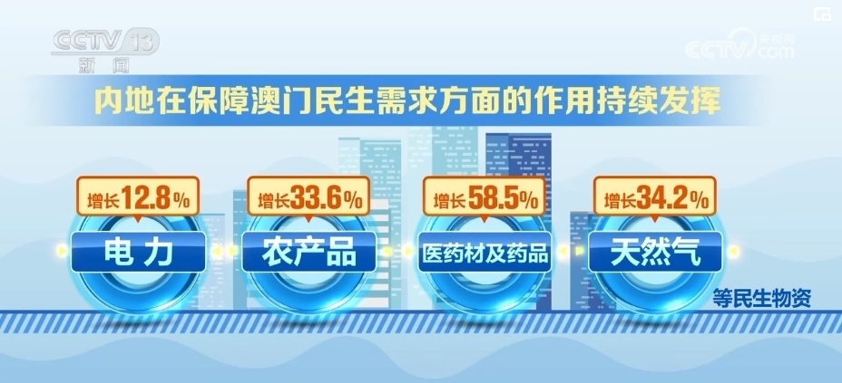 內(nèi)地對澳門出口商品結(jié)構(gòu)更加多元。2023年以來,內(nèi)地經(jīng)拱北海關對澳門地區(qū)出口機電產(chǎn)品74億元,占同期總值的37.4%,而1999年的比重不足10%。此外,電力、農(nóng)產(chǎn)品、醫(yī)藥材及藥品、天然氣等民生物資分別增長12.8%、33.6%、58.5%、34.2%,內(nèi)地在保障澳門民生需求方面的作用持續(xù)發(fā)揮。