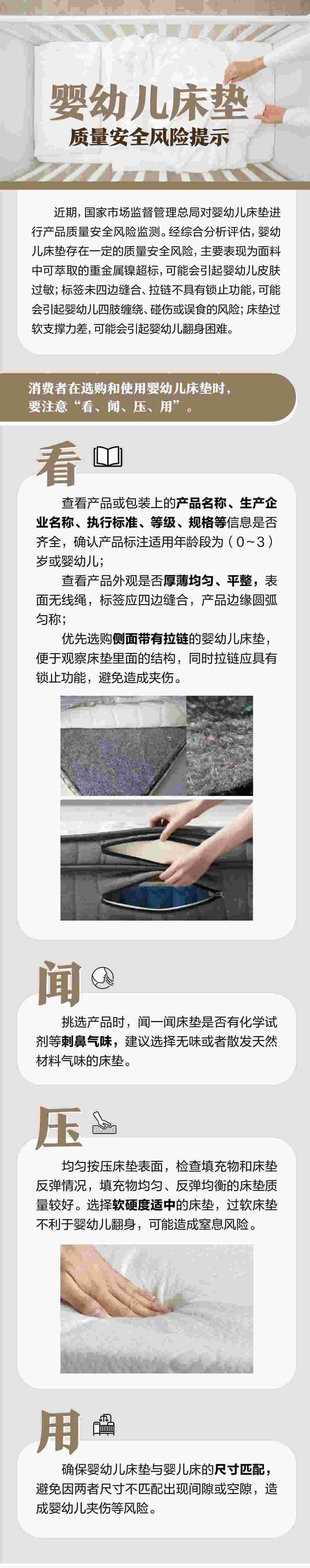 嬰幼兒床墊存在一定的質(zhì)量安全風(fēng)險,主要表現(xiàn)為面料中可萃取的重金屬鎳超標(biāo),可能會引起嬰幼兒皮膚過敏;標(biāo)簽未四邊縫合、拉鏈不具有鎖止功能,可能會引起嬰幼兒四肢纏繞、碰傷或誤食的風(fēng)險;床墊過軟支撐力差,可能會引起嬰幼兒翻身困難。