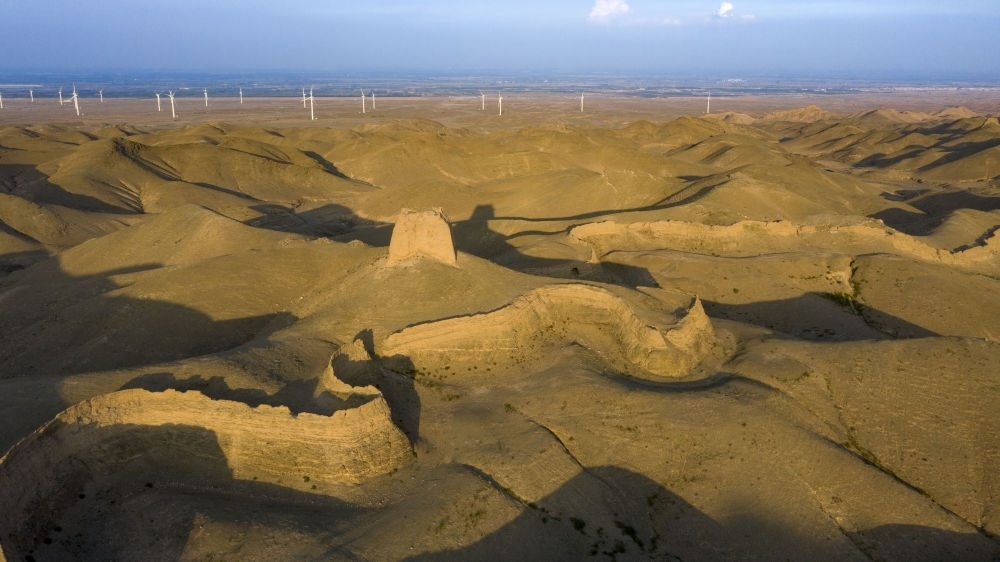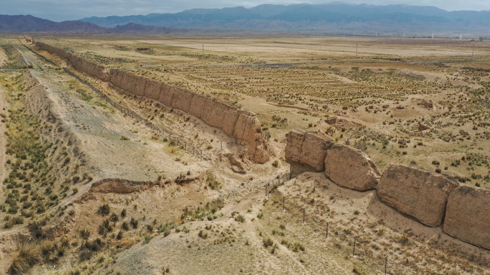 這是位于寧夏銀川市境內(nèi)的三關口土夯明長城(無人機照片,2021年8月13日攝)。