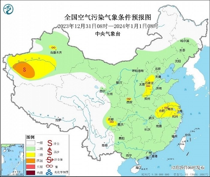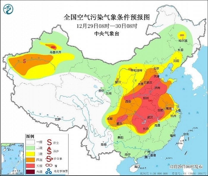 今天至30日白天,將是本次霧和霾天氣過(guò)程影響最重的時(shí)段,預(yù)計(jì)華北中南部、黃淮中西部、汾渭平原、江漢、四川盆地等地將有輕至中度霾,其中,天津、河北中南部、山東西部、河南北部等地有重度霾。29日夜間至30日的早晨至上午時(shí)段,華北中南部、黃淮、江淮等地的部分地區(qū)仍有大霧天氣,今天18時(shí)將繼續(xù)發(fā)布大霧預(yù)警。