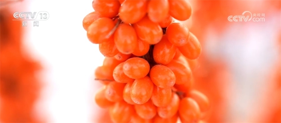 總臺(tái)記者 崔寧:我現(xiàn)在是在新疆生產(chǎn)建設(shè)兵團(tuán)第九師170團(tuán)的萬畝沙棘種植基地。這些小果就是已經(jīng)成熟的沙棘,我們來看,密密麻麻的,有黃豆大小,顏值非常高。我們平時(shí)熟悉的沙棘飲料、沙棘果油就是由它來生產(chǎn)的。沙棘的品種有很多,像我們現(xiàn)在看到的這種叫做大果沙棘,產(chǎn)量相對(duì)來說比較高,每畝地能夠達(dá)到平均800公斤。