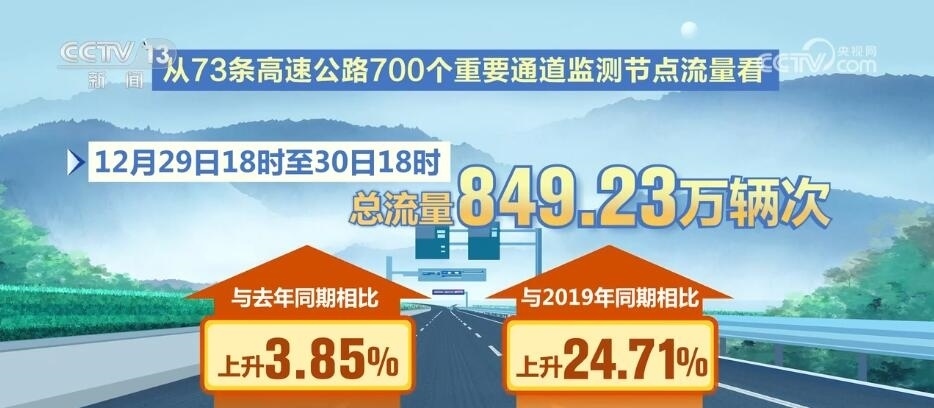 從公安部交管局選取的73條高速公路700個重要通道監(jiān)測節(jié)點流量看,12月29日18時至30日18時總流量849.23萬輛次,與去年同期相比上升3.85%,與2019年同期相比上升24.71%;從53條國道300個重要通道監(jiān)測節(jié)點流量看,12月29日18時至30日18時總流量183.01萬輛次,與去年同期相比上升21.37%,與2019年同期相比上升53.57%。