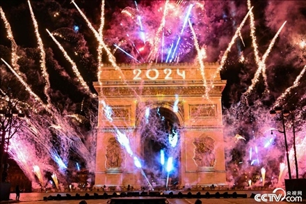 當(dāng)?shù)貢r間2024年1月1日,法國巴黎舉行新年慶?;顒?,凱旋門前燃放煙花。
