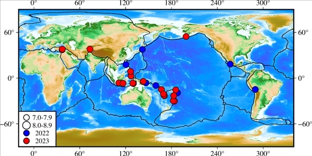 2022年和2023年全球7級以上地震分布圖